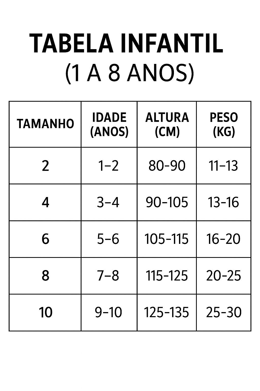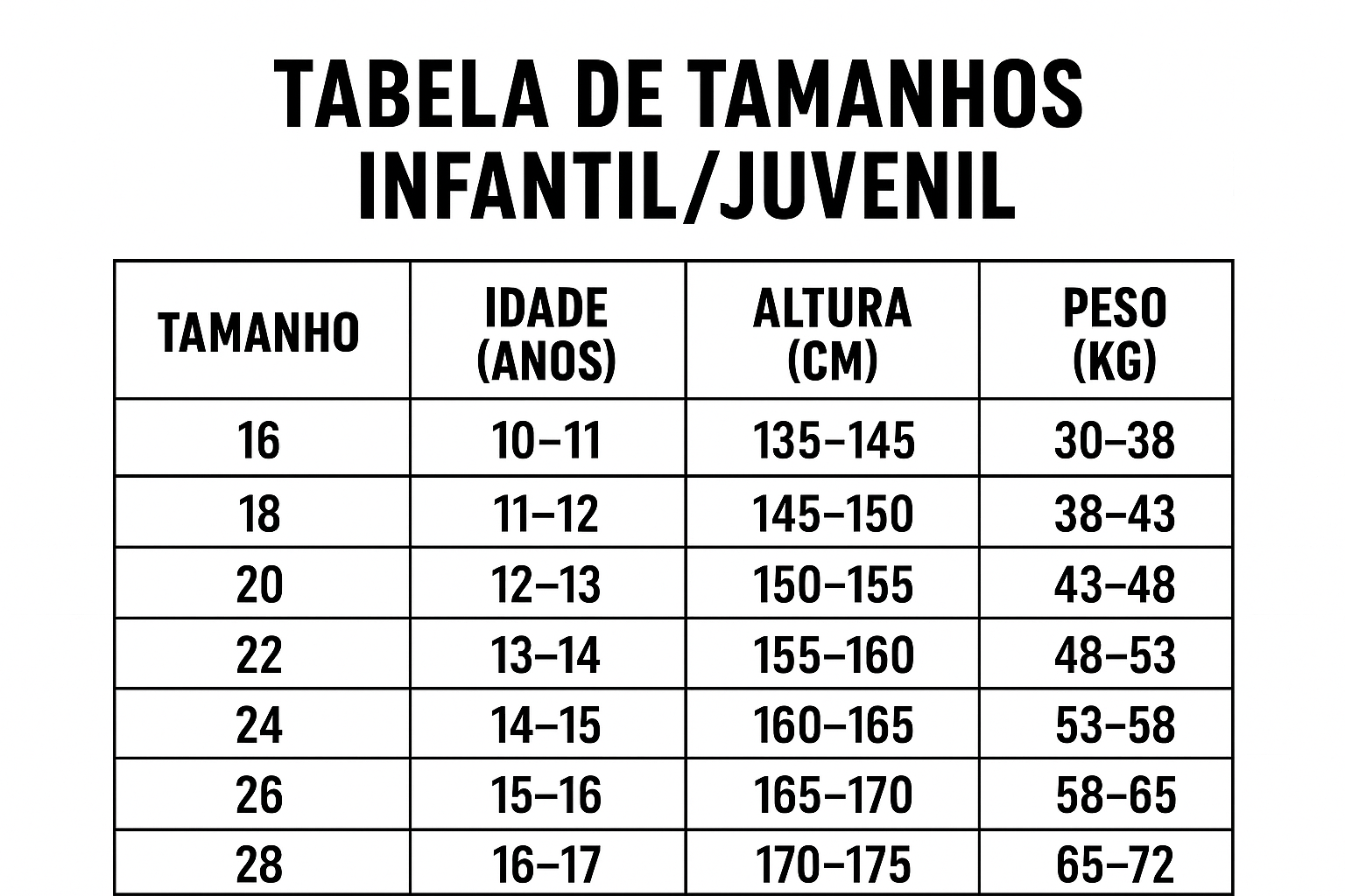 👉 Dica: Para um ajuste perfeito, escolha o tamanho de acordo com a idade e altura da criança. Para mais conforto, escolha sempre um número maior.